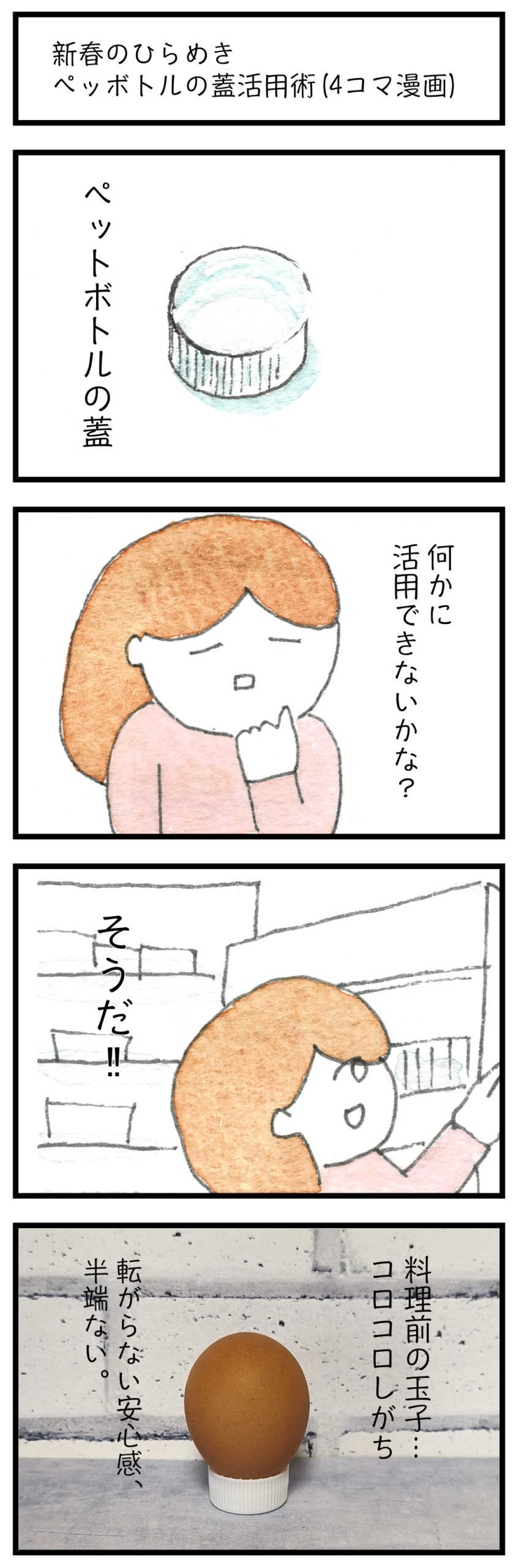 新春のひらめき ペットボトルの蓋活用術(透明水彩4コマ漫画)